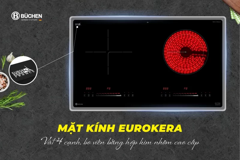 Một trong những điểm nổi bật khiến Bếp từ Buchen BUC775MH trở nên khác biệt chính là mặt kính Eurokera, sản xuất tại Pháp, được biết đến với độ bền và khả năng chống trầy xước tuyệt vời. Mặt kính này có khả năng chịu nhiệt cao, dễ dàng lau chùi và duy trì vẻ đẹp bền lâu. Các cạnh vát tinh tế cùng viền hợp kim nhôm cao cấp không chỉ nâng tầm giá trị thẩm mỹ cho không gian bếp mà còn giúp bảo vệ bề mặt bếp khỏi các tác động bên ngoài. Điều này đảm bảo rằng bếp luôn giữ được vẻ mới mẻ dù sử dụng lâu dài.
