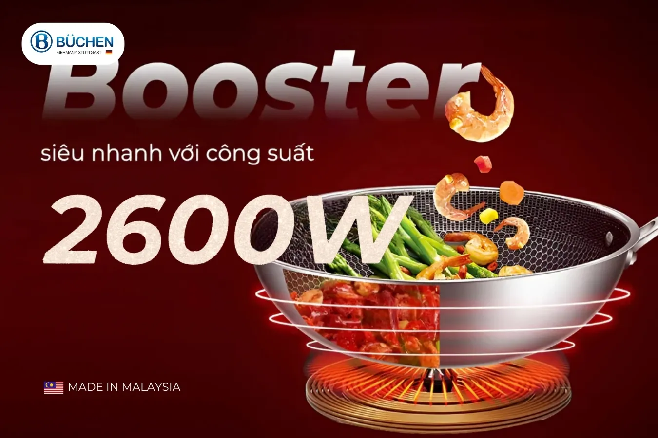 Chỉ trong chốc lát sau khi kích hoạt tính năng này, nhiệt lượng trên vùng nấu từ tăng lên công suất tương đương với mức nhiệt lượng lớn nhất. Do đó, các món ăn được nấu chín nhanh hơn, tiết kiệm thời gian vào bếp cho chị em nội trợ. Chức năng Booster nấu siêu nhanh, tuy nhiên thời gian tối đa mặc định dùng chức năng này là 10 phút / lần tránh quá tải.