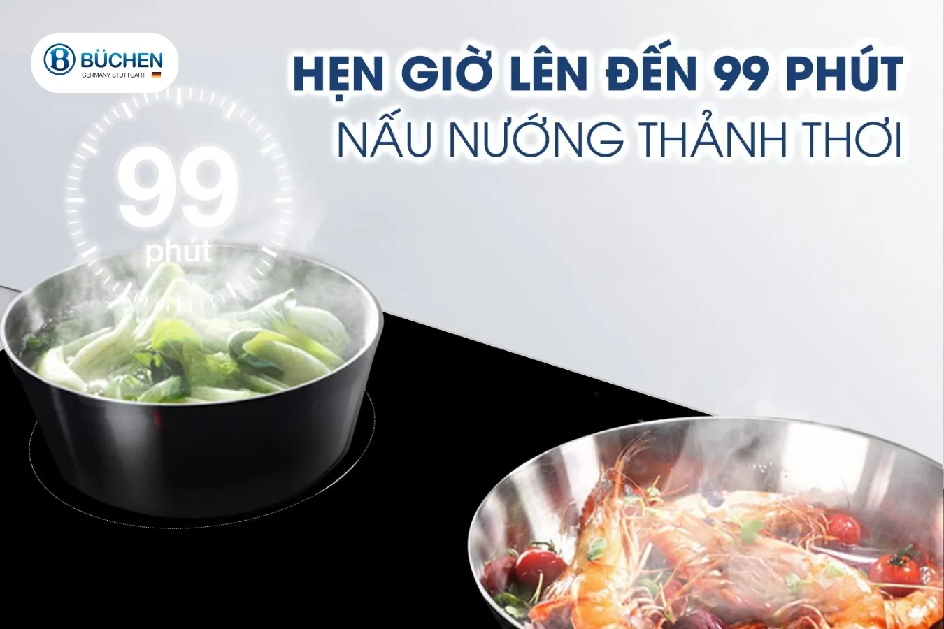 Hẹn giờ giới hạn thời gian hoạt động: Bếp từ Buchen BUC775ID có khả năng hẹn giờ độc lập từng vùng nấu từ 00-99 phút, người dùng có thể dễ dàng thiết lập thời gian đun nấu, bếp sẽ tư động ngắt khi hết thời gian đã được cài đặt