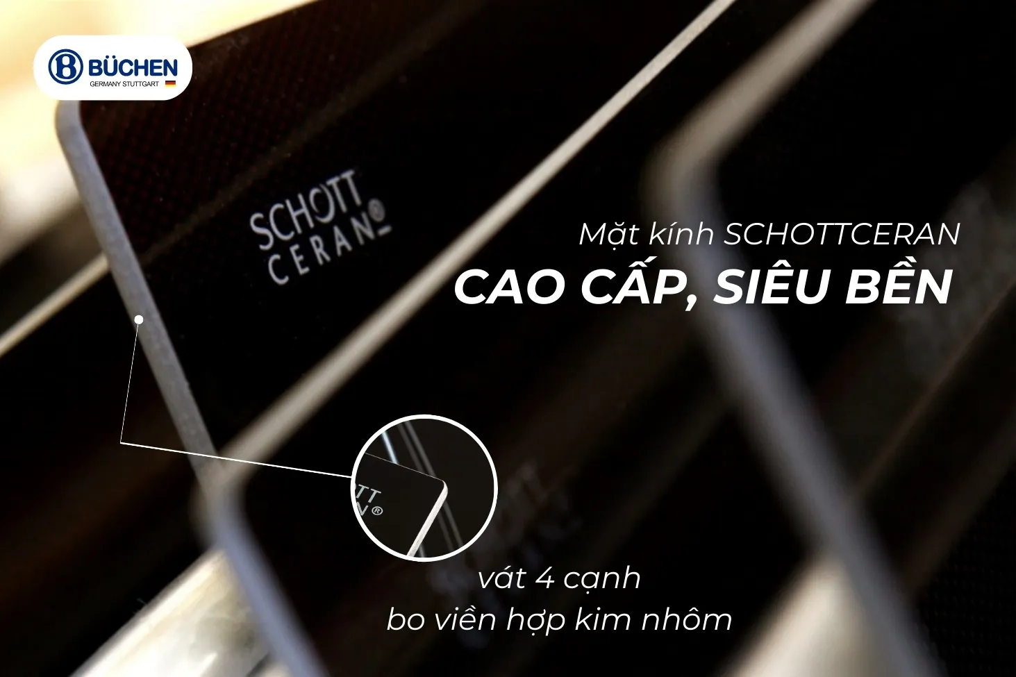 - Mặt Kính SCHOTT CERAN: Bếp được trang bị mặt kính SCHOTT CERAN (Made in Germany), nổi tiếng về khả năng chịu nhiệt, chịu lực tốt và chống trầy xước hiệu quả. Bề mặt kính vát 4 cạnh, kết hợp với bo viền hợp kim nhôm cao cấp không chỉ tăng tính thẩm mỹ mà còn bảo vệ mép kính khỏi va đập.