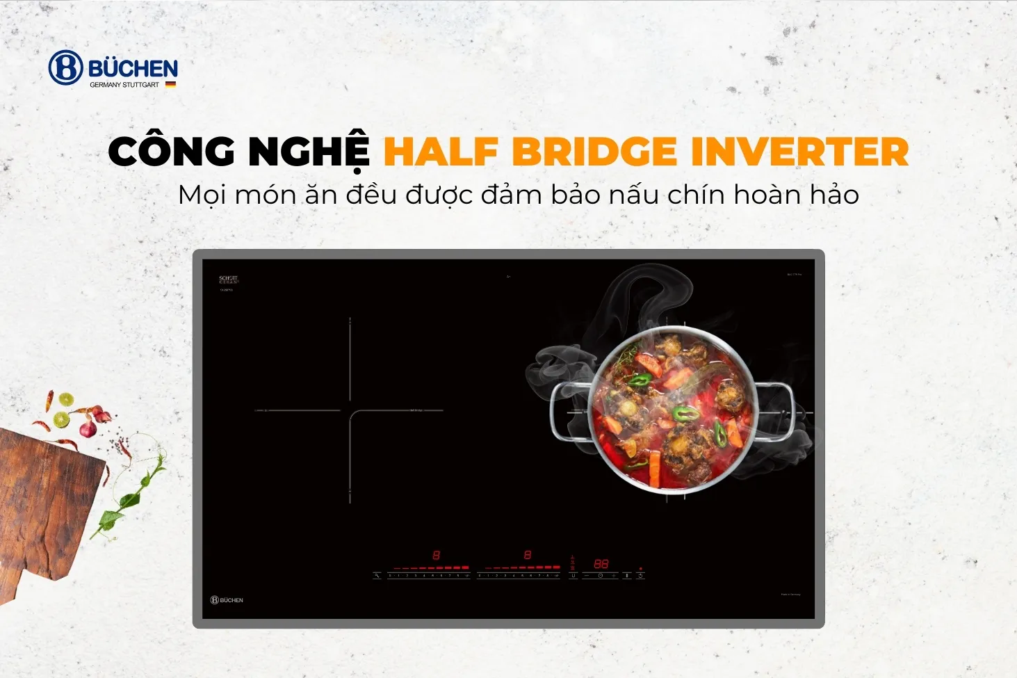 Một trong những điểm nhấn nổi bật của Bếp từ Buchen BUC779 Pro là công nghệ Half Bridge INVERTER thông minh. Công nghệ này duy trì nhiệt độ ổn định trong suốt quá trình nấu mà không phải tắt bật. Điều này không chỉ giúp bếp hoạt động ổn định mà còn tiết kiệm được đến 41% năng lượng so với các bếp truyền thống.
