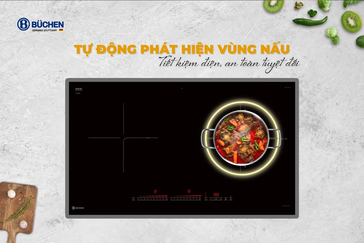 Một trong những tính năng đáng chú ý của Bếp từ Buchen BUC779 Pro là khả năng tự động phát hiện vùng nấu. Khi không có nồi hoặc nồi không phù hợp, bếp sẽ không kích hoạt, tránh tình trạng lãng phí năng lượng và đảm bảo an toàn tuyệt đối cho người dùng.