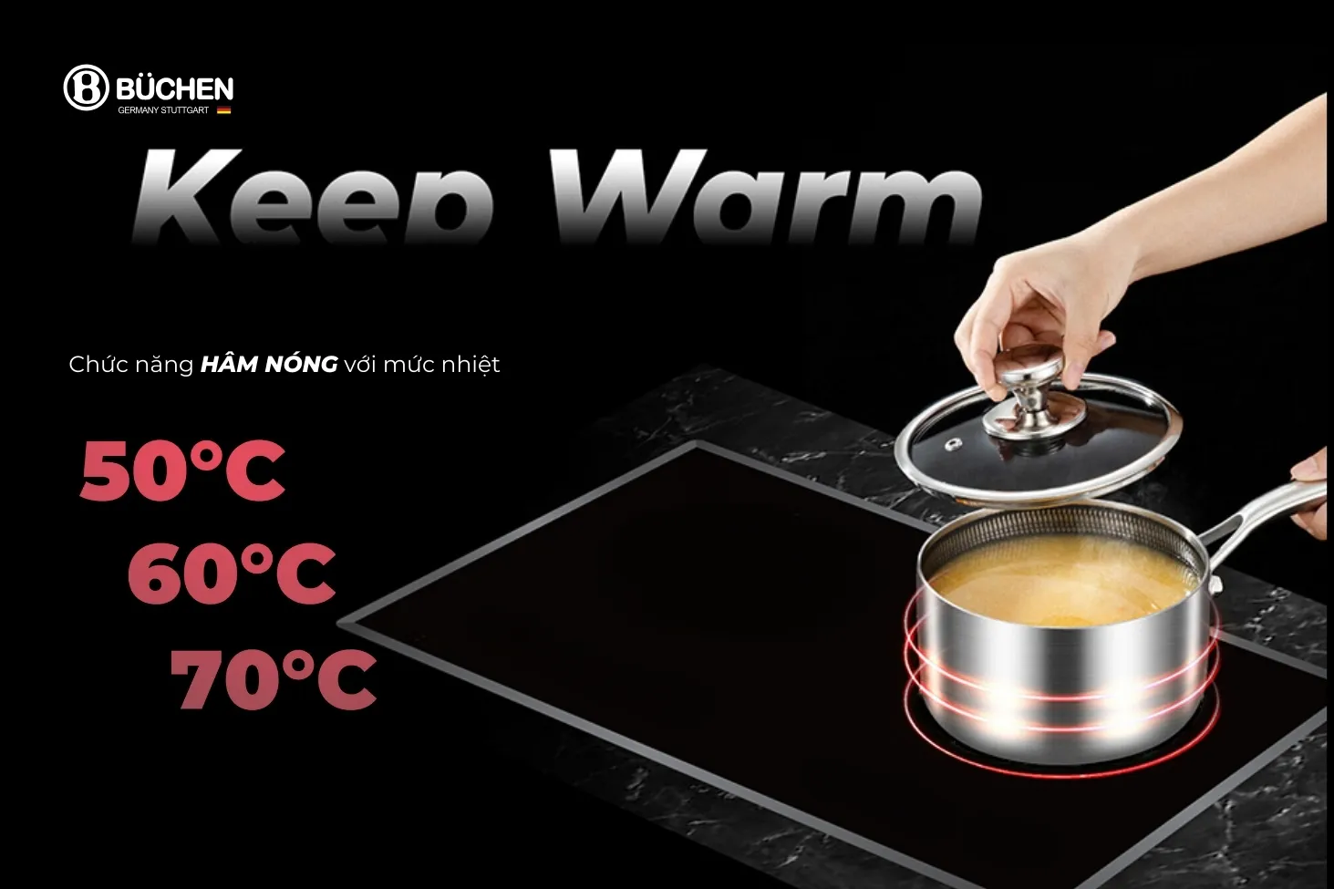 Bếp từ Buchen BUC779 Pro không chỉ giúp bạn nấu nướng nhanh chóng mà còn có thể giữ ấm thức ăn một cách hoàn hảo. Với ba mức nhiệt độ 60°C, 70°C và 80°C, bạn có thể giữ món ăn ở nhiệt độ lý tưởng mà không lo bị nguội hay mất đi hương vị.