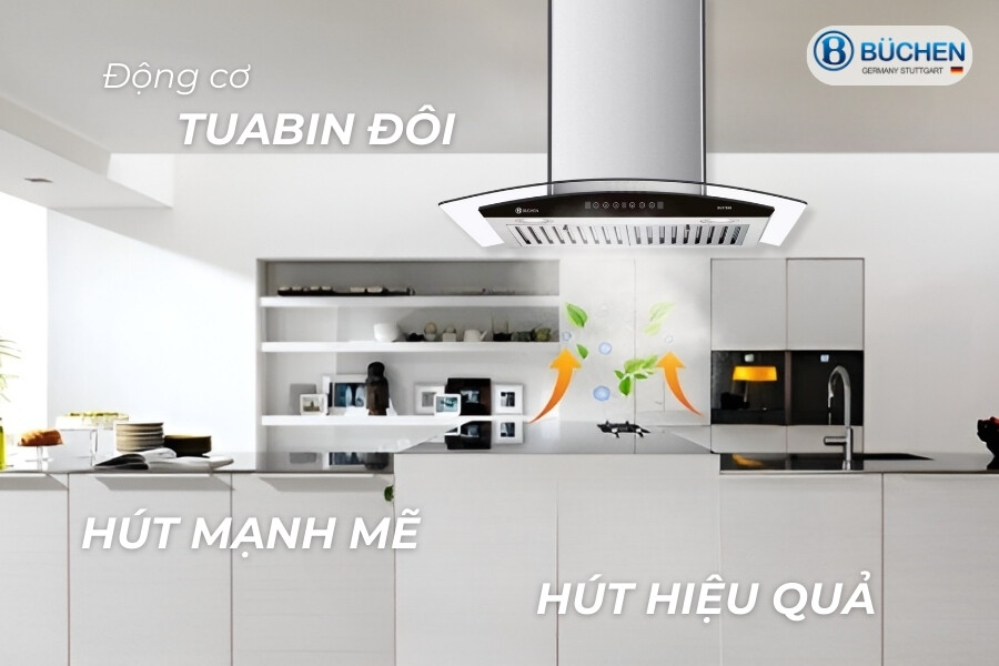 Công suất hút khỏe, động cơ tuabin đôi: Máy hút mùi Buchen BU3788B được trang bị động cơ tuabin đôi nhằm tạo ra một công suất hút lớn nhất. Công suất hút cực mạnh 1100m3/h giúp hút hết các mùi thức ăn làm sạch không khí mang lại cho căn bếp luôn thông thoáng. Máy hút mùi hoạt động dựa trên nguyên tắc của quạt thông gió kết hợp với các màng lọc. Máy thường bao gồm các bộ phận cơ bản như: lớp toa inox bên ngoài, hệ thống dẫn khí, lưới lọc, quạt hút, đèn chiếu sáng, đèn báo hiệu mức độ bám bẩn và bảng điều khiển tốc độ hút. Các loại khí độc hại và mùi khó chịu sẽ được hút lên bằng turbin (hoặc động cơ moter) và chuyển ra ngoài, còn bụi bẩn và các hạt dầu mỡ sẽ bám lại lớp màng lọc, có thể dễ dàng tháo ra để vệ sinh và thay mới thiết bị.