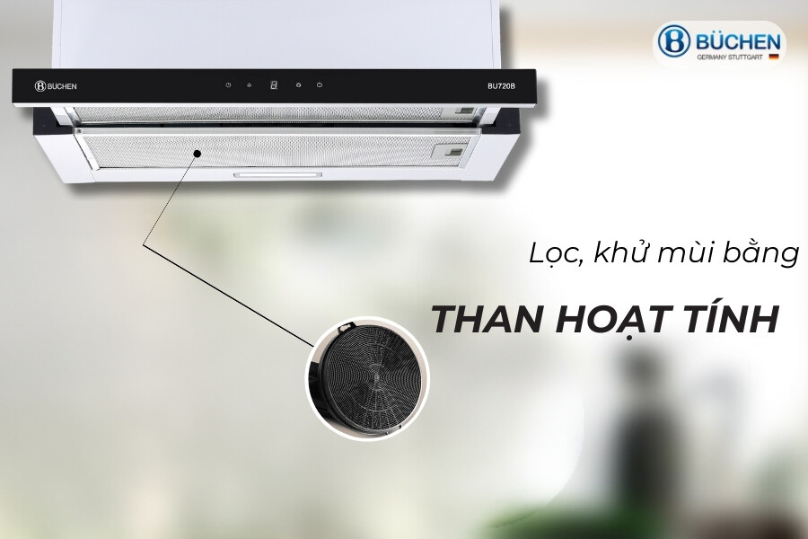 Hệ thống than hoạt tính cho không khí trong lành Máy hút mùi Buchen BU720B được trang bị hệ thống than hoạt tính, có tác dụng khử mùi, thanh lọc không khí và dầu mỡ hiệu quả. Không khí trong lành và sạch sẽ lên đến 99% trong không gian bếp của bạn.