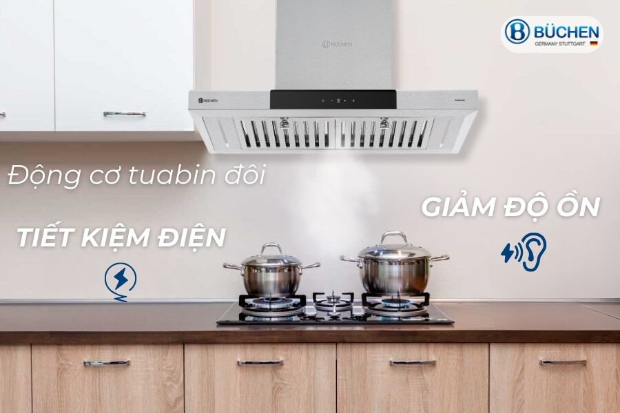 Công suất hút khỏe, động cơ tuabin đôi: Máy hút mùi Buchen BU89DWK được trang bị động cơ tuabin đôi nhằm tạo ra một công suất hút lớn nhất. Công suất động cơ 190W, công suất hút cực mạnh lên tới 1200m3/h giúp hút hết các mùi thức ăn làm sạch không khí mang lại cho căn bếp luôn thông thoáng. Máy hút mùi hoạt động dựa trên nguyên tắc của quạt thông gió kết hợp với các màng lọc. Máy thường bao gồm các bộ phận cơ bản như: lớp toa inox bên ngoài, hệ thống dẫn khí, lưới lọc, quạt hút, đèn chiếu sáng, đèn báo hiệu mức độ bám bẩn và bảng điều khiển tốc độ hút. Các loại khí độc hại và mùi khó chịu sẽ được hút lên bằng motor và chuyển ra ngoài, còn bụi bẩn và các hạt dầu mỡ sẽ bám lại lớp màng lọc, có thể dễ dàng tháo ra để vệ sinh và thay mới thiết bị.