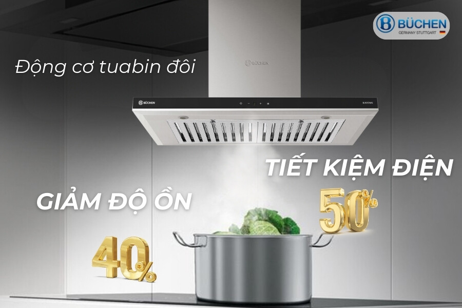 Công suất hút khỏe, động cơ tuabin đôi: Máy hút mùi Buchen BU97DWS được trang bị động cơ tuabin đôi nhằm tạo ra một công suất hút lớn nhất. Công suất động cơ 190W, công suất hút cực mạnh lên tới 1200m3/h giúp hút hết các mùi thức ăn làm sạch không khí mang lại cho căn bếp luôn thông thoáng. Máy hút mùi hoạt động dựa trên nguyên tắc của quạt thông gió kết hợp với các màng lọc. Máy thường bao gồm các bộ phận cơ bản như: lớp toa inox bên ngoài, hệ thống dẫn khí, lưới lọc, quạt hút, đèn chiếu sáng, đèn báo hiệu mức độ bám bẩn và bảng điều khiển tốc độ hút. Các loại khí độc hại và mùi khó chịu sẽ được hút lên bằng motor và chuyển ra ngoài, còn bụi bẩn và các hạt dầu mỡ sẽ bám lại lớp màng lọc, có thể dễ dàng tháo ra để vệ sinh và thay mới thiết bị.